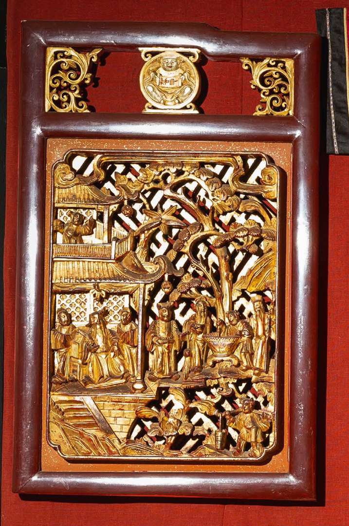 Deux panneaux en bois doré, à décor de scènes d'audience auprès de dignitaires près de pavillons et pins.