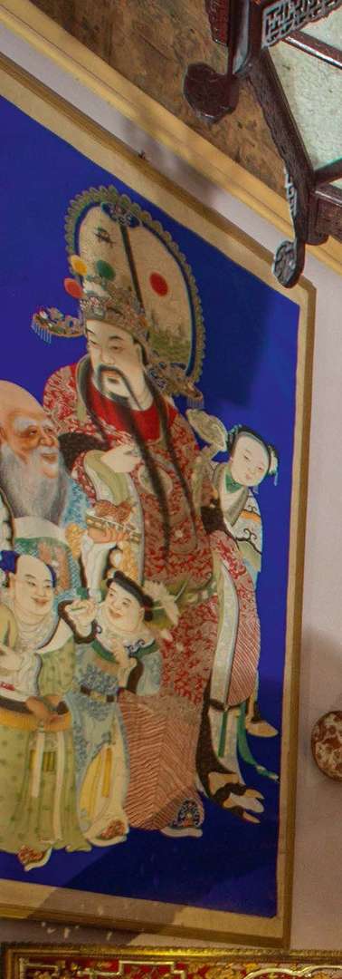 Grande peinture sur fond bleu, à décor d'un empereur tenant un sceptre ruyi, accompagné de Zhoulao, des frères Hoho et d'une servante.