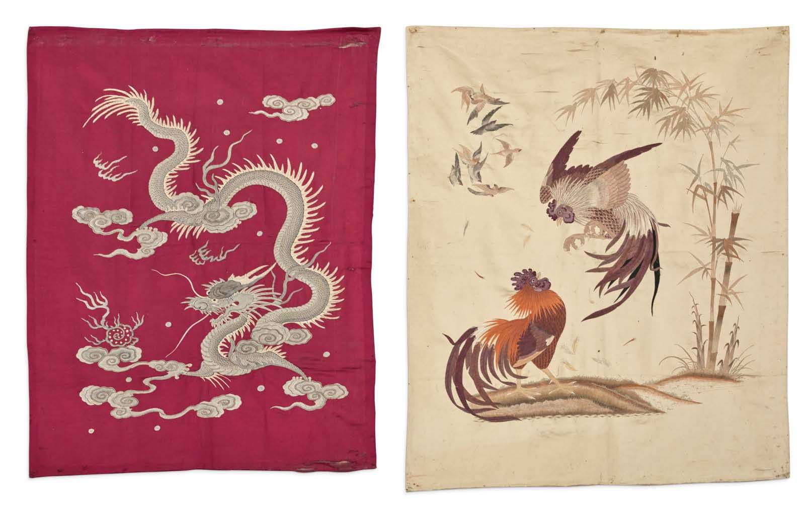 Deux tentures sur soie, l'une représentant un dragon faisant face au joyau sacré parmi des nuages sur fond lie-de-vin, l'autre sur fond beige de deux coqs affrontés parmi des bambous.
