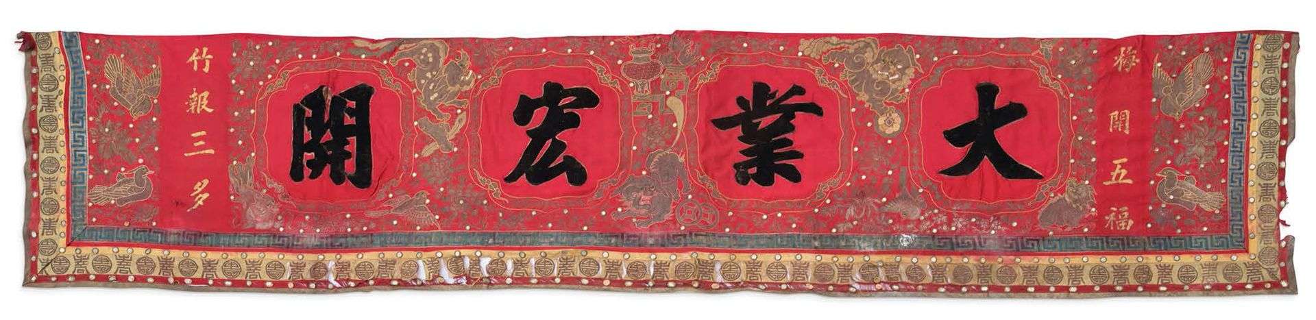 Grande tenture en soie et lin brodée de fils polychromes et dorés, à décor sur fond rouge de caractères auspicieux, parmi lions bouddhiques, agrémentée de petits miroirs.