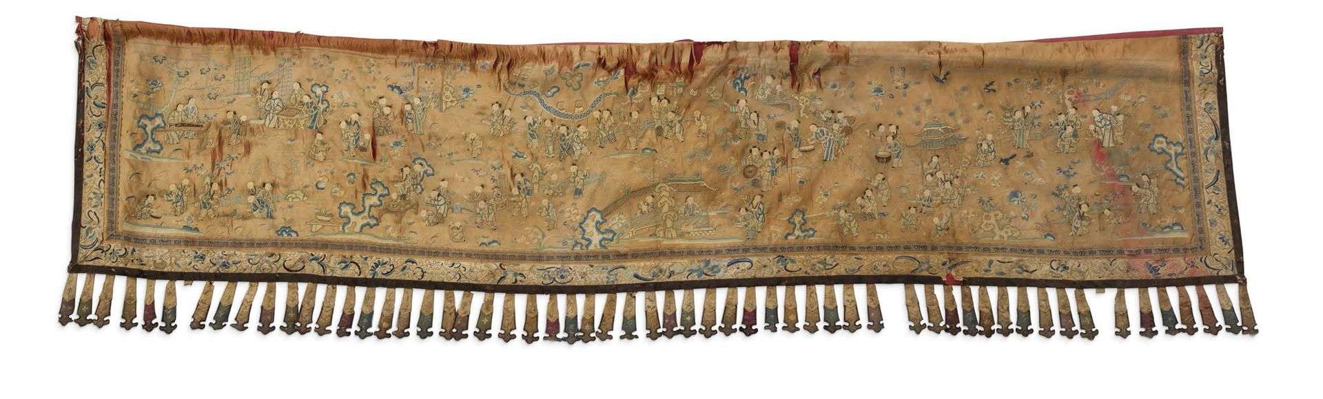 Deux panneaux en soie et lin brodés, à décor sur fond rose pâle des cent enfants dans un jardin.