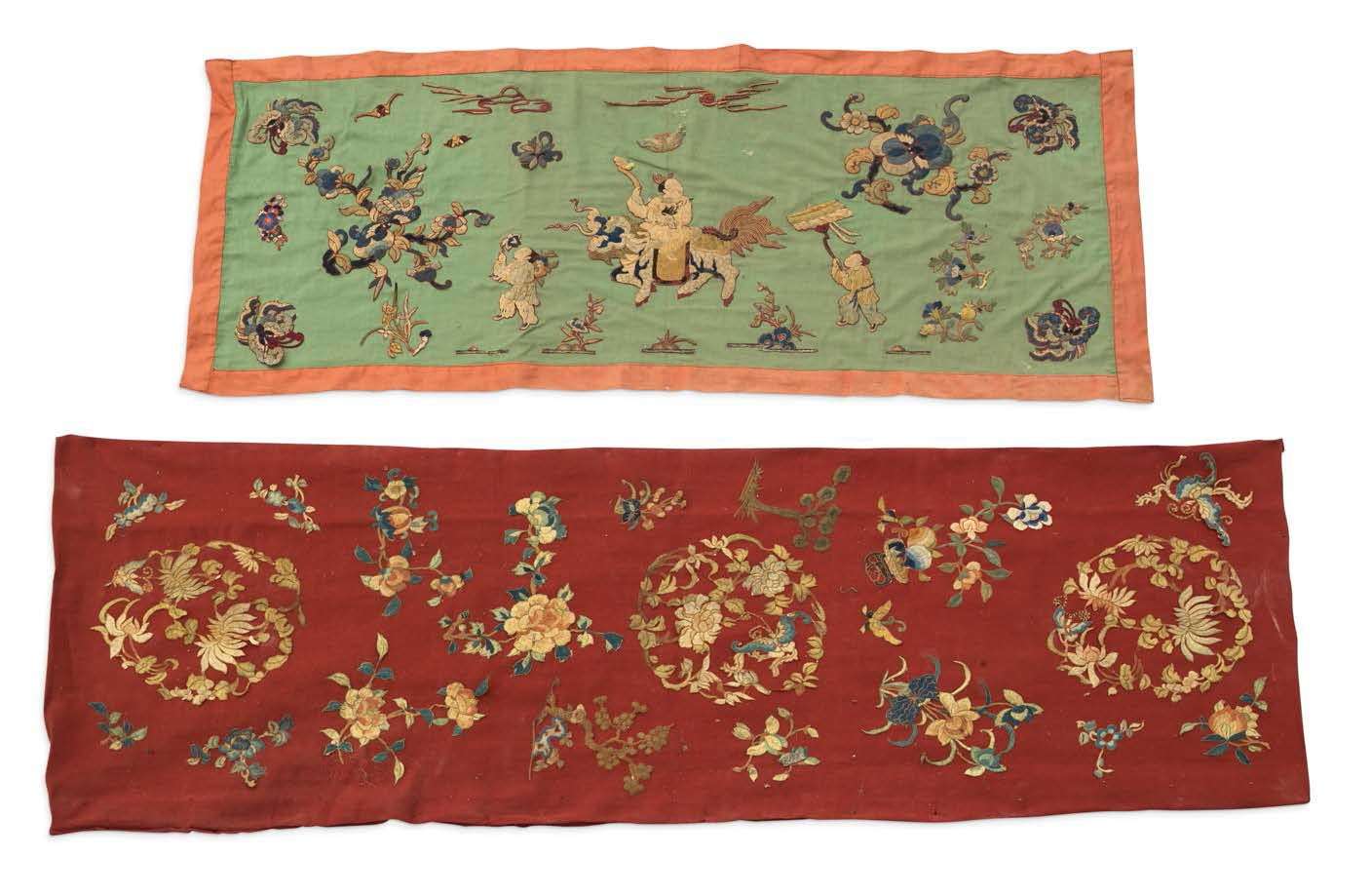 Deux panneaux en soie et fils polychromes brodés, l'un à décor d'un immortel sur un dragon avec serviteurs sur fond vert, l'autre à décor de papillons et fleurs sur fond rouge.
