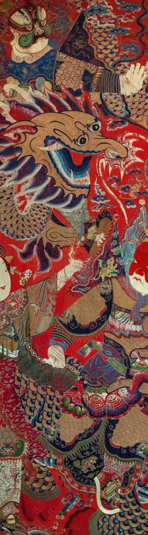 Deux grandes tentures en soie brodées, sur fond rouge, à décor de personnages de théâtre et lions bouddhiques.