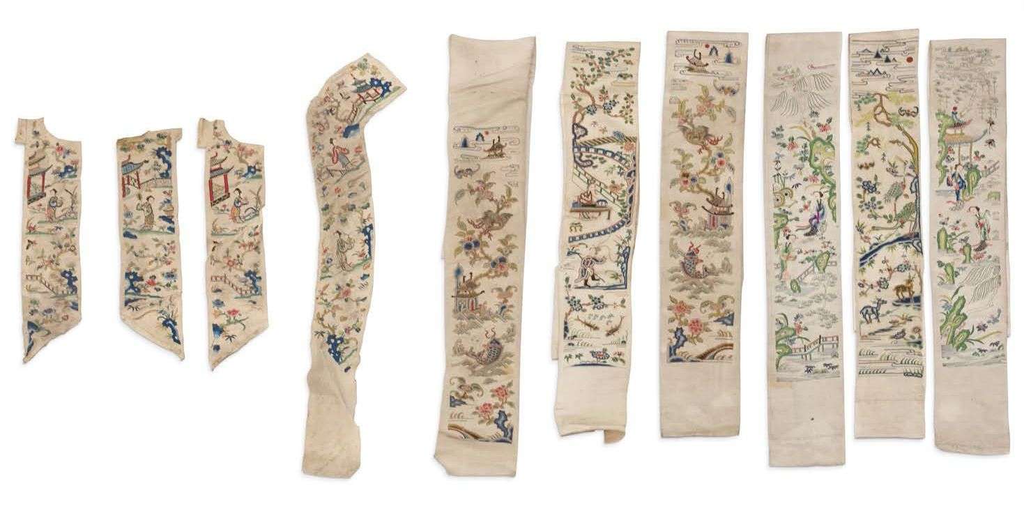Ensemble de onze petits éléments brodés sur fond crème, à décor de personnages, oiseaux et fleurs.