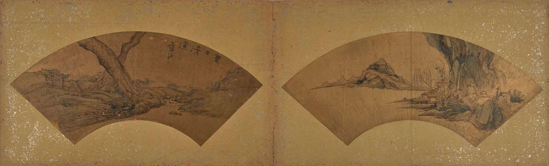 Grand album comprenant vingt-deux projets d'éventail à décor de paysages, fleurs et poèmes calligraphiés, avec cachets sur certains d'entre eux, l'ensemble sur papier or. Couverture en tissu à décor de dragons pourchassant la perle sacrée sur fond bleu et vert.