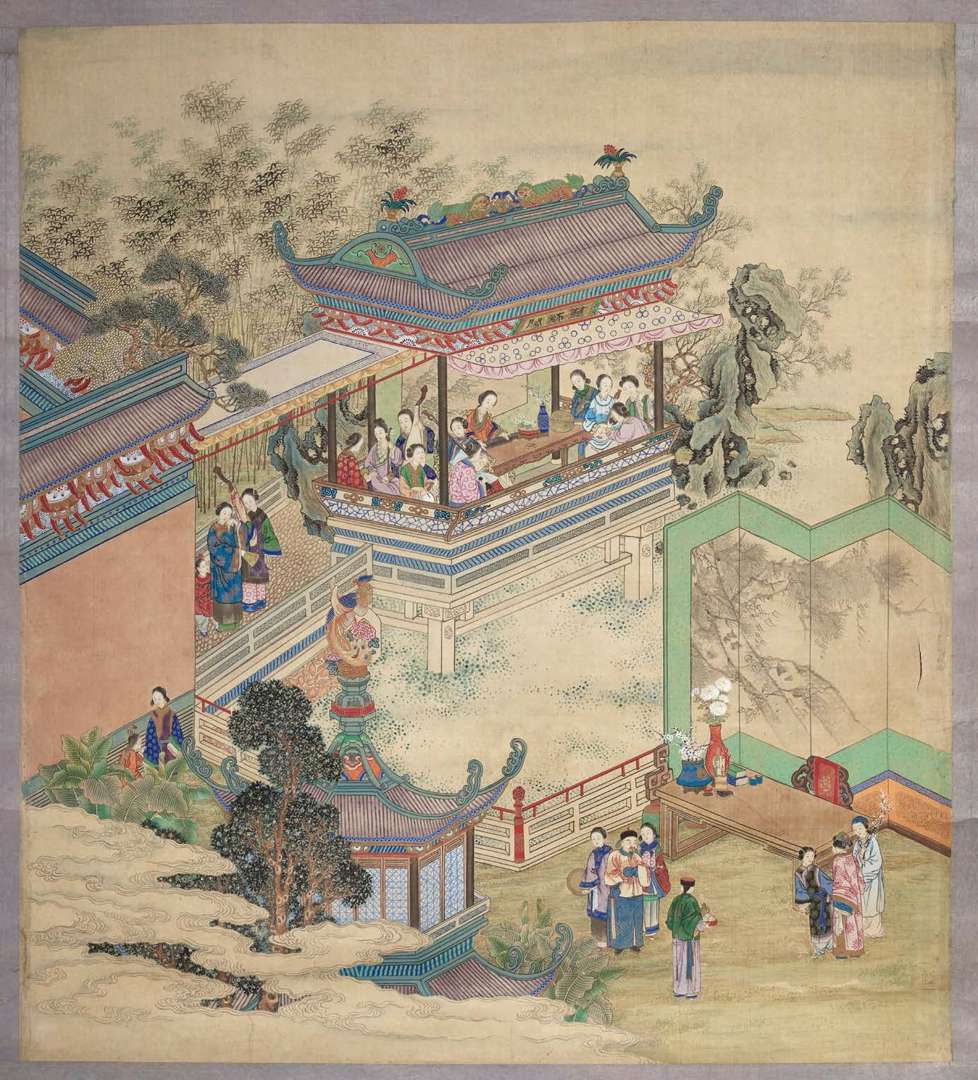 Grande peinture à l'encre et couleurs sur soie, représentant des jeunes femmes dans des pavillons s'adonnant à la couture, musique et lecture.