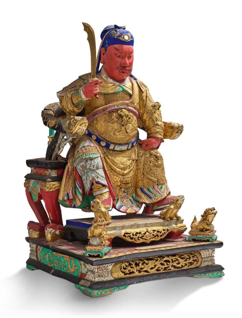 Sujet en bois polychrome et rehaussé d'or, représentant l'empereur des Perles assis en majesté sur un trône, tenant son glaive.