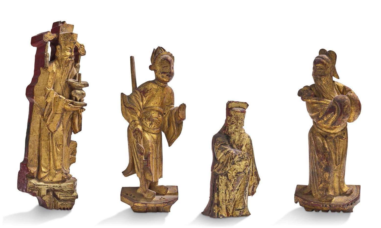 Quatre sujets en bois doré, représentant des dignitaires et divinités du Tao.