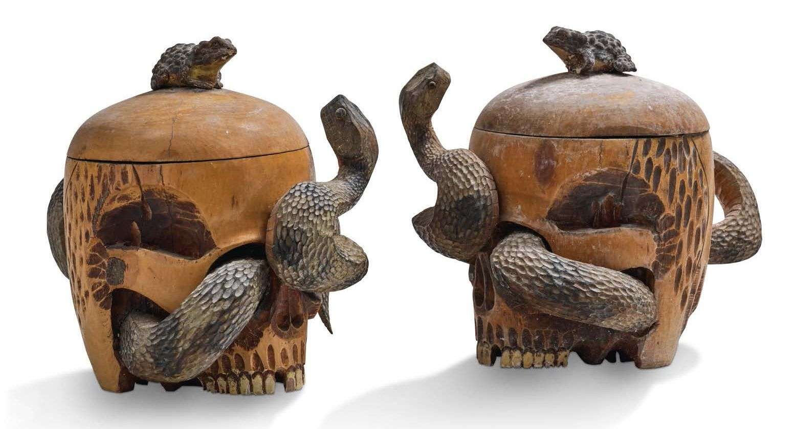 Deux boîtes couvertes en bois, représentant deux crânes traversés par serpents, rappelant les vanités, les prises des couvercles en forme de crapaud.