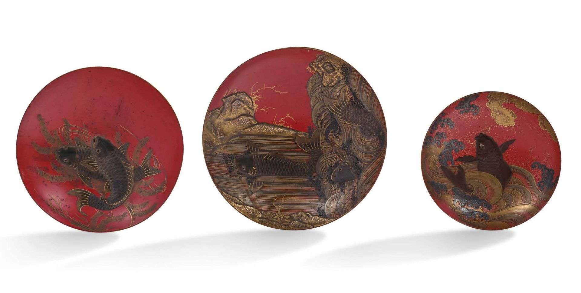 Trois petites coupes de mariage en laque or et brune, à décor sur fond rouge de carpes parmi des plantes aquatiques.