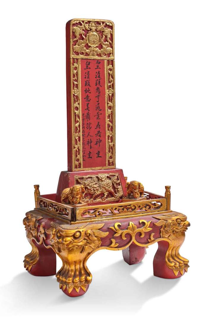 Stèle surmontée des wufu encadrant le caractère shou, reposant sur un socle à quatre pieds crachés par des têtes de lion. Avec deux petits éléphants.