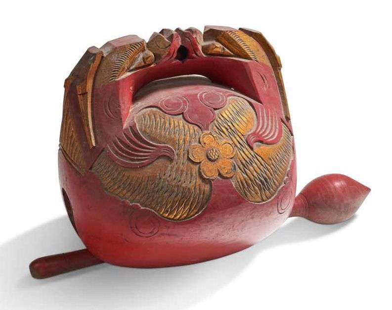 Grande cloche Mokugyo en bois laqué rouge et or avec son baton.