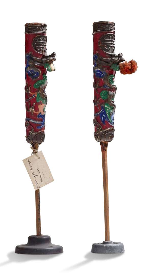 Deux cierges de pagodes en bois, peints de polychromie, à décor de dragons parmi des nuages.