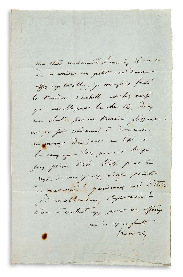 « Ma chère madame Delannoi, il vient de m'arriver un petit accident assez déplorable, je me suis foulé le tendon d'Achille et les nerfs qui envellopent la cheville, dans une chute sur un terrain glissant et je suis condamné à demeurer au moins dix jours au lit, à la campagne sans pouvoir bouger sous peine d'être blessé pour le reste de mes jours, ainsi point de mercredi ! pardonnez moi d'être si malheureux, c'est arrivé bien à contretemps pour mes aff aires. un de vos enfants Honoré ».