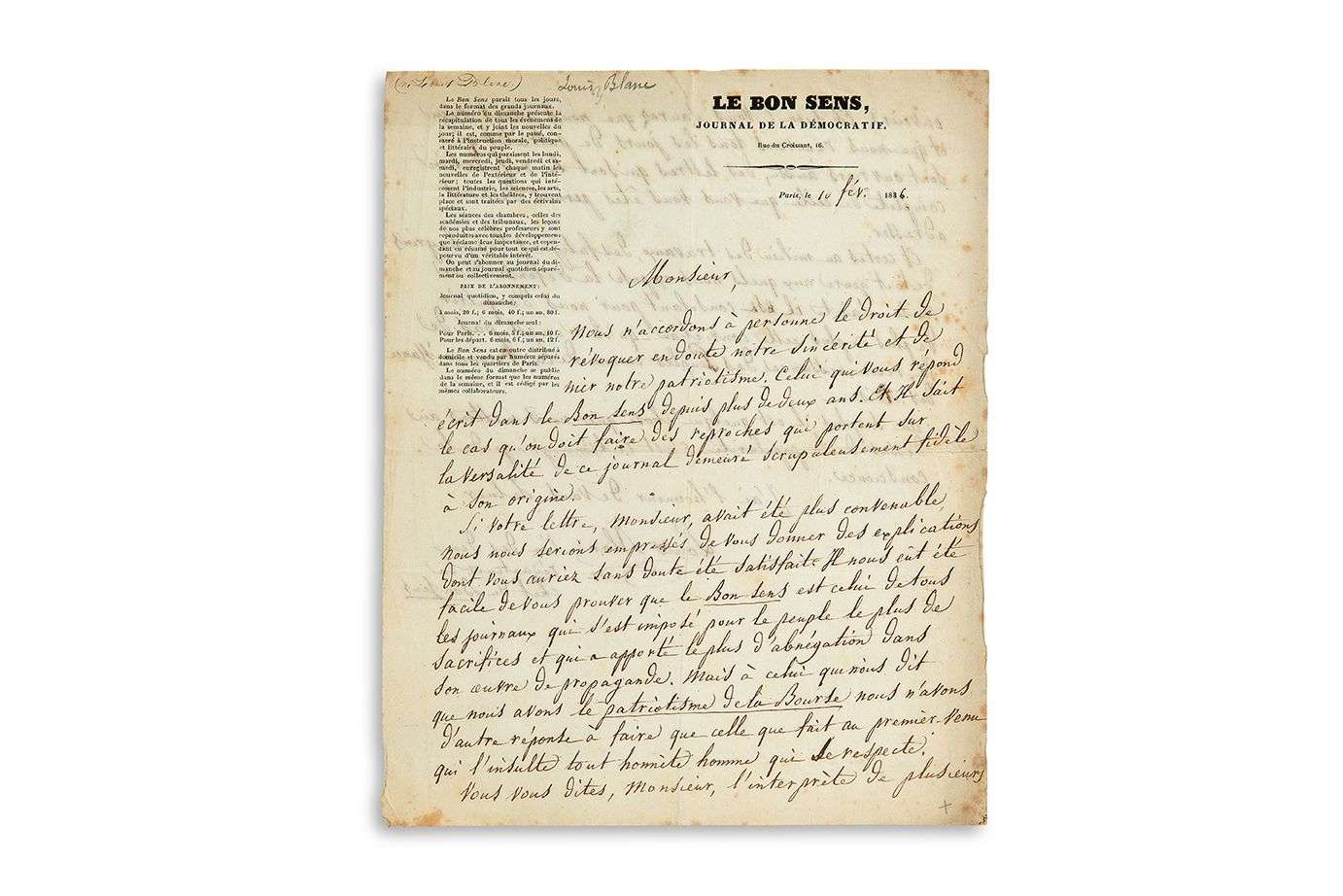 L.A.S. « Louis Blanc l'un des deux rédacteurs en chef du Bon Sens », Paris 10 février 1836 : 2 pages in-4 à en-tête