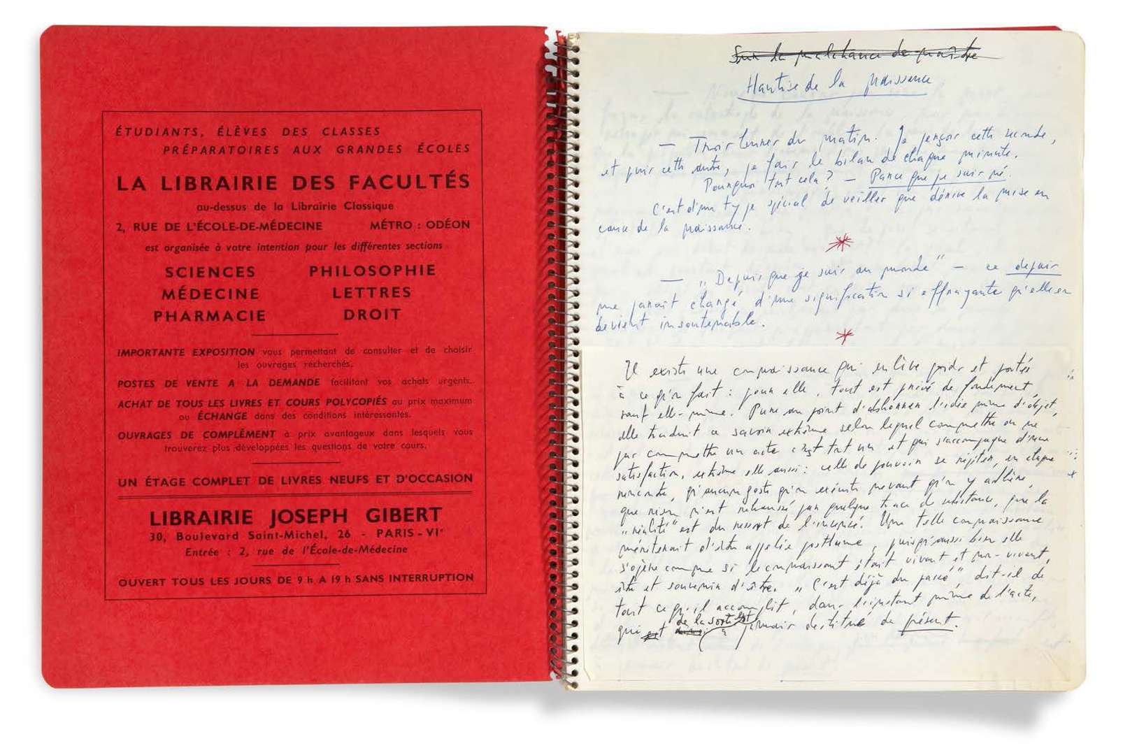 MANUSCRIT autographe pour De l'inconvénient d'être né | 40 pages in-4 dans un cahier à spirale, couverture cart. rouge (Librairie-papeterie Joseph Gibert, 27 x 21 cm).