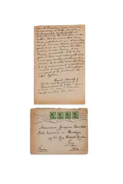 Jacques Douillet (1893-1974) comprenant 9 lettres autographes signées de Paul Claudel (dont 7 avec enveloppe) et 3 de l'abbé Douillet (minutes). Dans cette correspondance l'écrivain évoque à plusieurs reprises ses oeuvres dont L'Otage qui a semé le trouble chez le jeune séminariste.