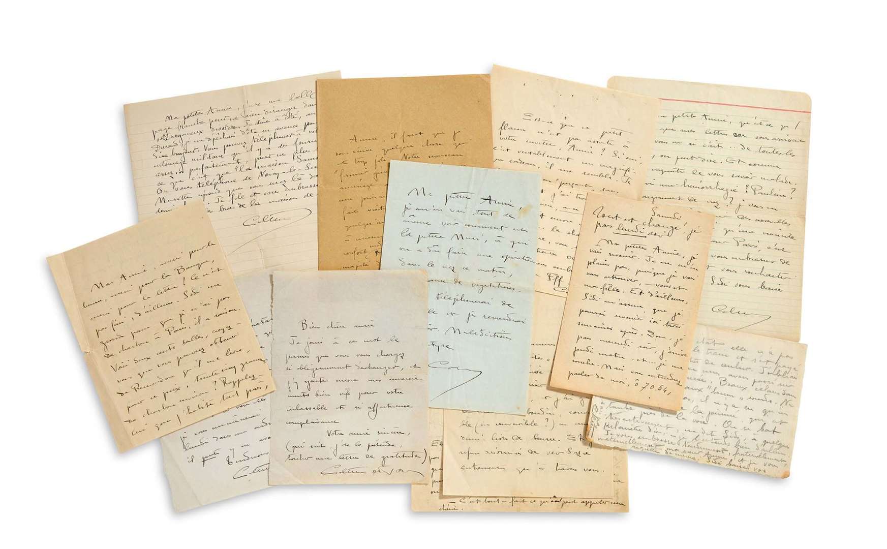 16 L.A.S. « Colette » (une « Colette de Jouvenel », [Verdun 1914- 1915, et Paris s.d.], à Annie de PÈNE | 52 pages et formats divers (la 1ère au crayon, qqs fentes aux plis centraux), une enveloppe.