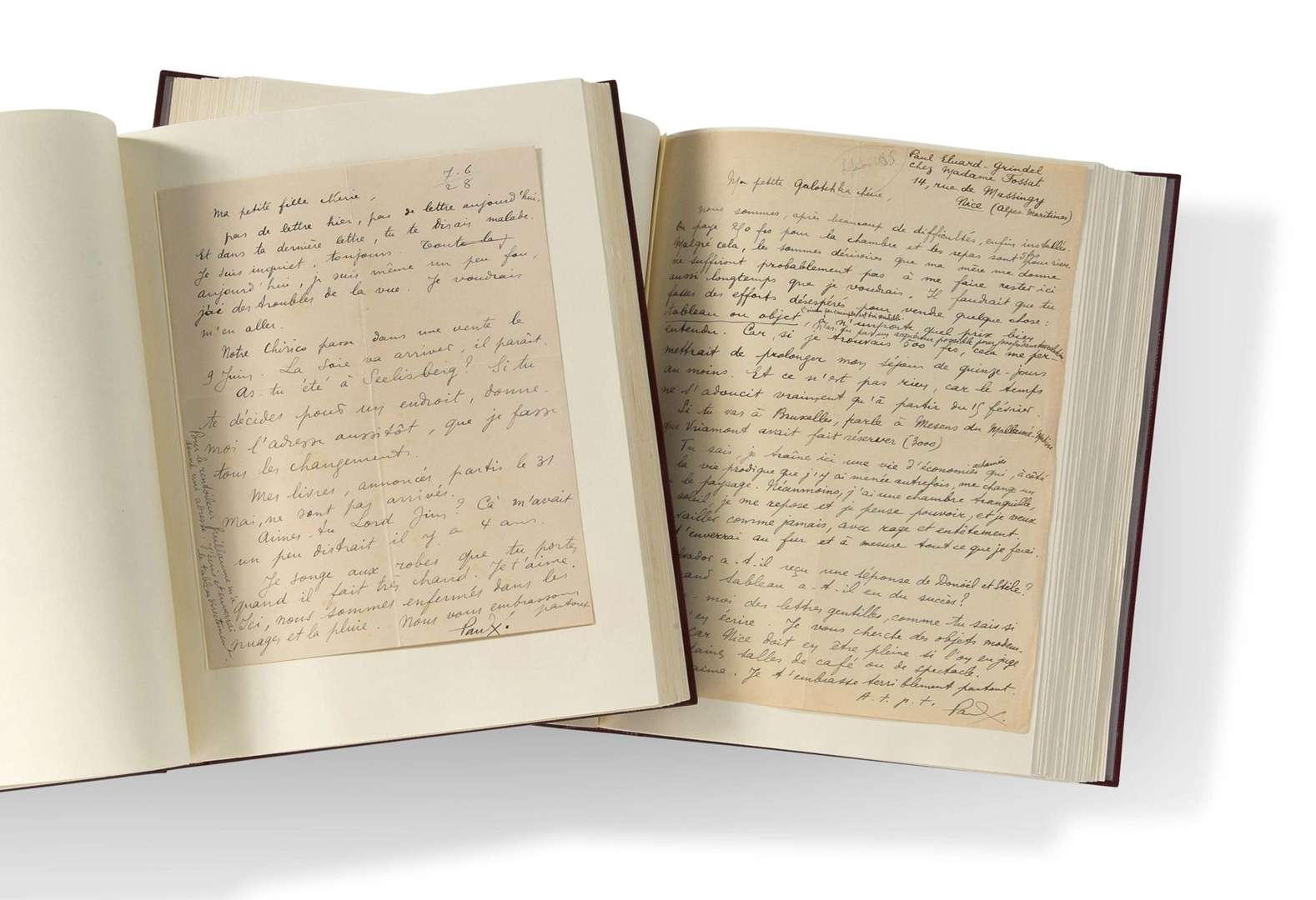 266 L.A.S. « Paul », 1924-1948, à GALA | 407 pages formats divers, dont 40 cartes postales (quelques lettres au crayon, 7 non signées, mouillure sur une lettre), quelques enveloppes, montées sur onglets sur des feuillets de papier vélin, le tout relié en 2 volumes in-4 (1924-1931 et 1932-1948), plein maroquin bordeaux, dos lisse titré or, doublures et gardes de daim gris souris, chemises titrées, étuis (C. et J.P. Miguet).