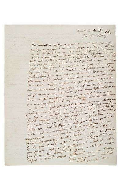 Magnifique lettre de Flaubert à sa «bonne Muse» et maîtresse Louise Colet, poétesse française. En pleine rédaction de Madame Bovary, il rend compte ici de ses progrès. (...) me sentant ce matin, en grande humeur de style, j'ai (...) empoigné ma Bovary, et j'ai esquissé trois pages dans mon après-midi (...). Le mouvement en est furieux & plein (...). Il offre même ici la primeur d'un dialogue entre Homais et Bovary qui réuni[t], je crois toutes les bêtises que l'on dit en province sur Paris. Flaubert évoque également les «sots & violents tracas» éprouvés par Louise Colet: en conflit avec l'un de ses anciens amants Octave Lacroix, secrétaire de Sainte-Beuve, cette dernière compte sur Leconte de Lisle (ici appelé Delisle) pour lui servir de champion et s'opposer en duel à Lacroix. Selon Flaubert, sur de pareilles merdes [il faut] passer de suite l'éponge (...).