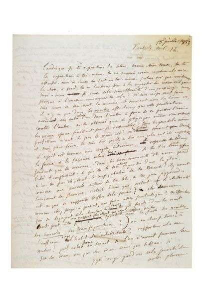 Lettre autographe signée «Ton...» adressée à sa maîtresse Louise COLET [Croisset] Vendredi soir 1h. [«15 juillet 1853» (de la main de Louise Colet)], 4 pages in-4 à l'encre, enveloppe avec cachet de cire rouge à son chiffre. (Quelques tâches aux angles).
