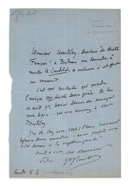 L.A.S. Lundi, 5h (circa janvier-mars 1874). 1 p. in-8 sur papier bleu.