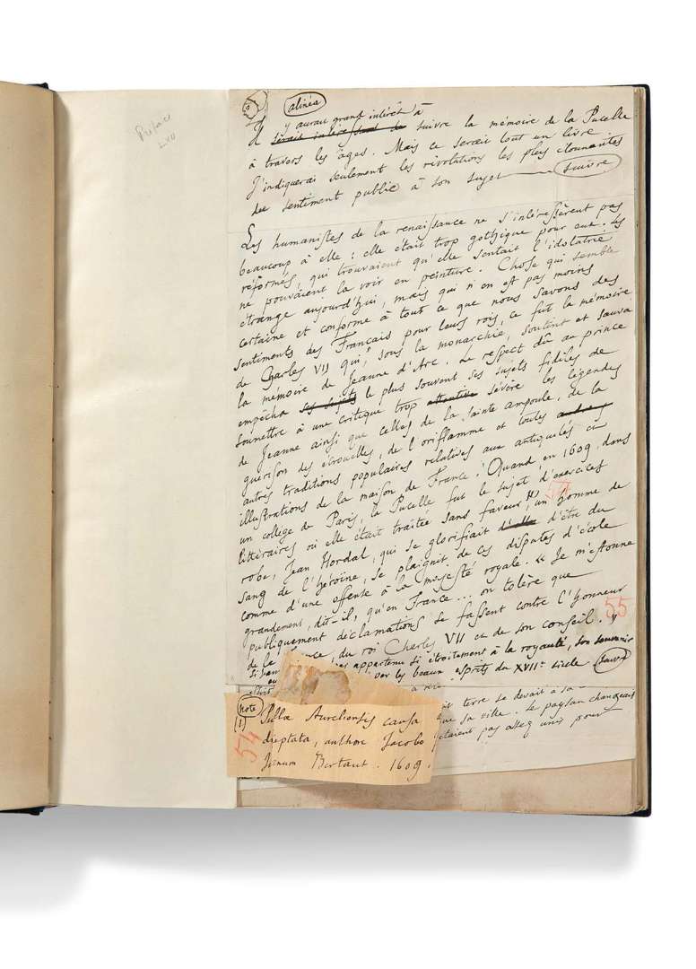 MANUSCRITS et NOTES autographes, et ÉPREUVES avec corrections et additions autographes, pour la Vie de Jeanne d'Arc | 230 feuillets de formats divers, dont une centaine entièrement autographes, montés sur onglets et reliés en un volume in-4, maroquin bleu, 3 filets sur les plats, dos orné de fleurs de lys et de motifs végétaux et mosaïqué en long, à l'intérieur 3 filets avec motifs d'angle mosaïqués ornés d'épées et de fleurs de lys, gardes de soie brochée noire et mauve, doubles gardes, étui (Ch. Septier).