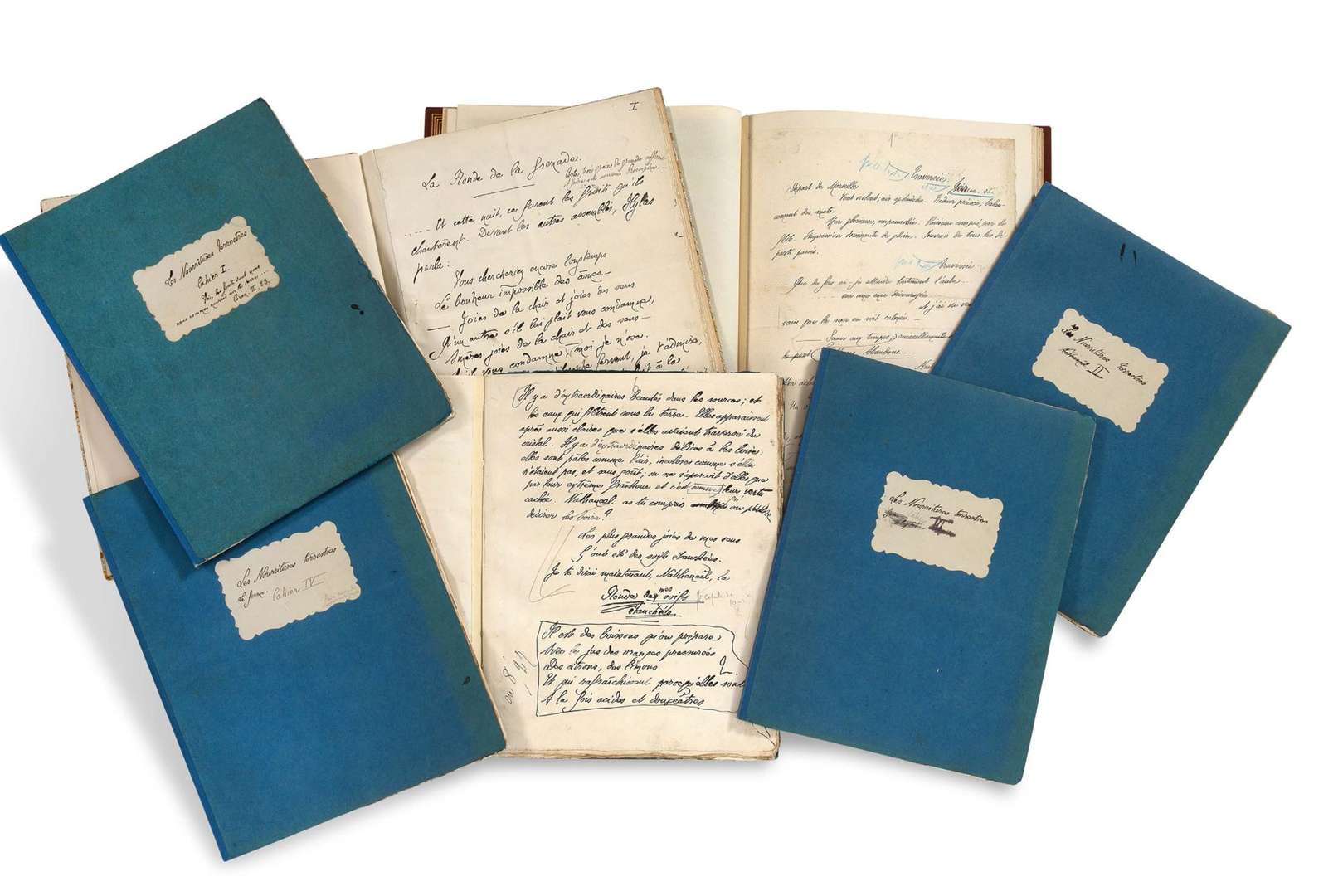 Cinq cahiers autographes. Cahiers in-4 (28 x 22 cm), couvertures de papier fort bleu, dos de percaline bleue | étiquettes de titre sur le plat sup. des couvertures | en tout 109 pages autographes à l'encre noire, plus 7 pages imprimées, sur papier vergé ivoire (à l'exception de quelques pages de plus petit format sur papier vélin), sous chemise et étui chagrin fauve (étui taché).