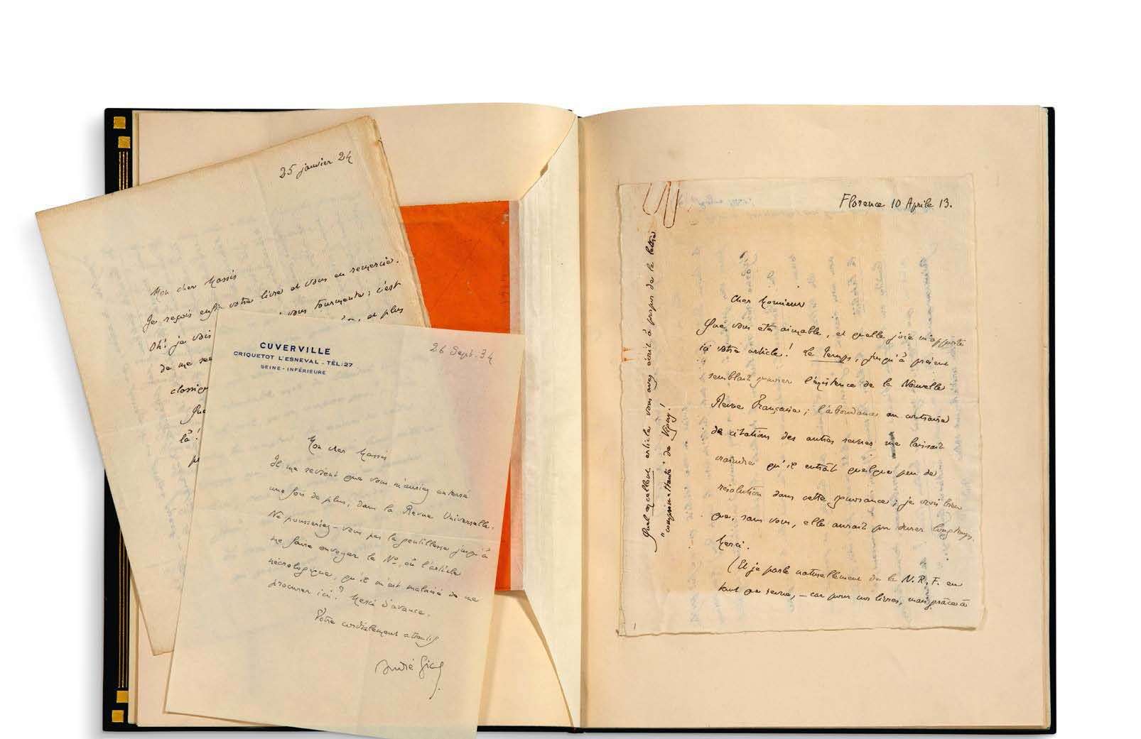 9 L.A.S. et 1 L.S. « André Gide », 1913-1928, à Paul SOUDAY | 19 pages formats divers, enveloppes, montées sur onglets dans un volume in-4, relié maroquin bleu nuit, dos à nerfs, coupes fi letées, encadrement intérieur de maroquin bleu fi leté, étui bordé (René Aussourd).