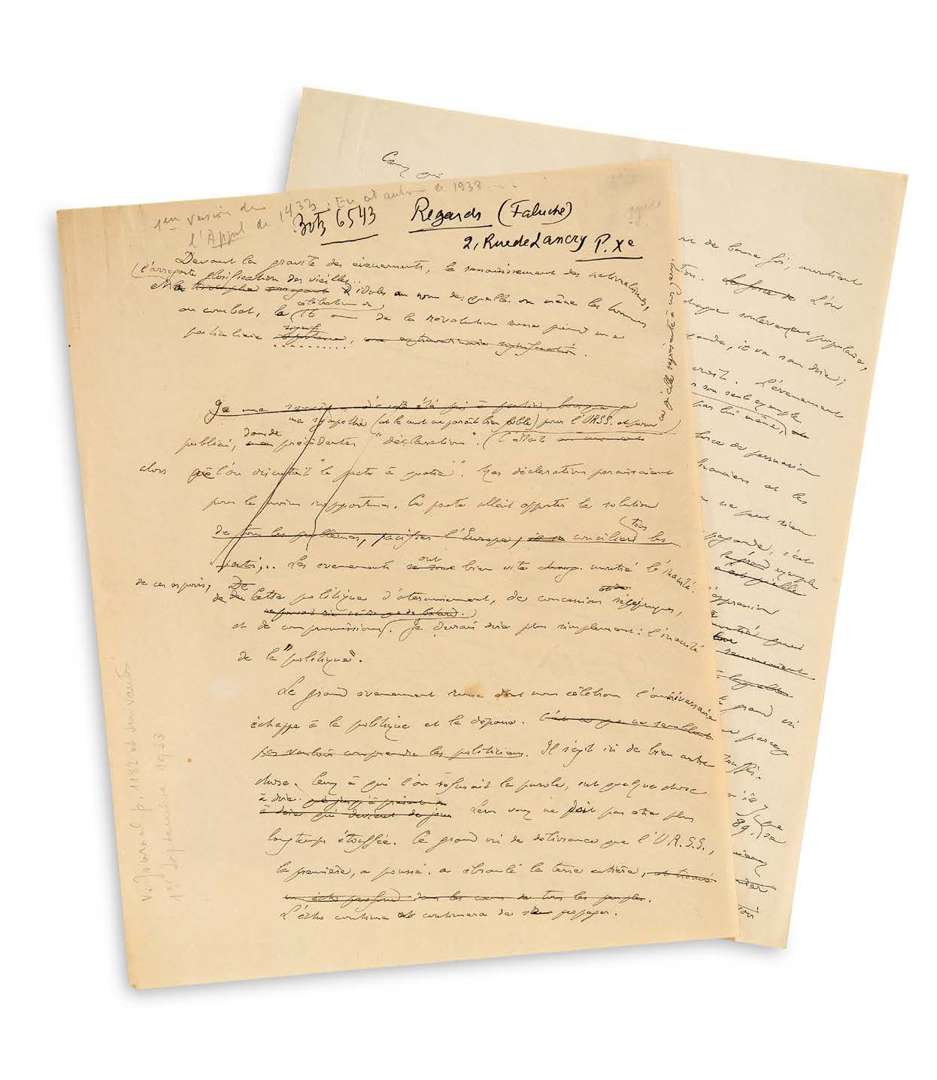Beau texte politique de Gide, écrit au moment où il commence à s'engager publiquement aux côtés des communistes. Le manuscrit, de tout premier jet, abondamment travaillé, comporte 34 corrections autographes, dont un long passage de six lignes biff ées parfaitement lisibles.