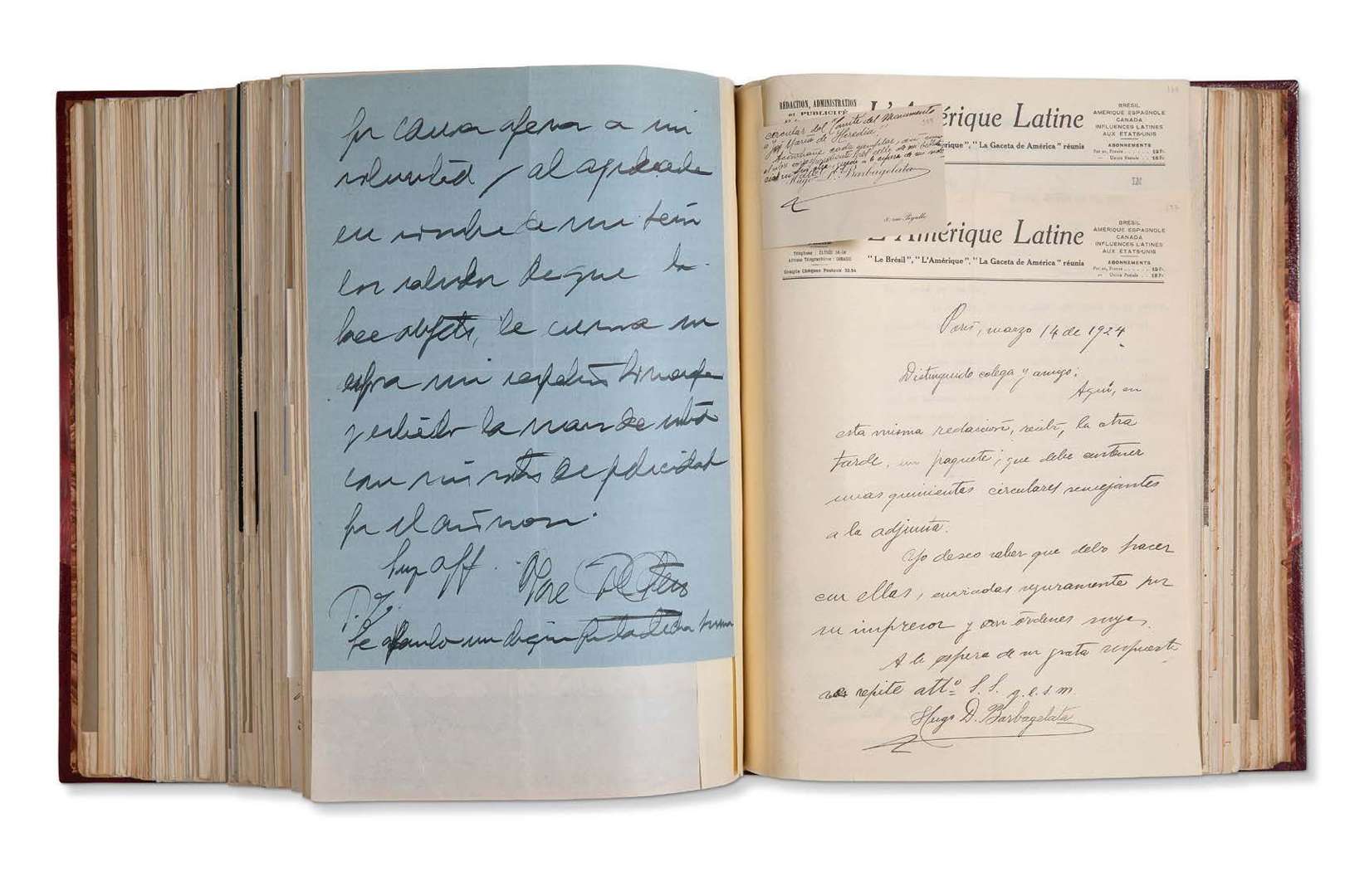 Correspondance reçue par Armand GODOY concernant le monument en l'honneur de José Maria de HEREDIA, 1925 | plus de 400 lettres et documents montés sur onglets, et un ensemble de coupures de presse, le tout relié en 2 forts volumes in-4 demi-maroquin grenat à coins (Canape).