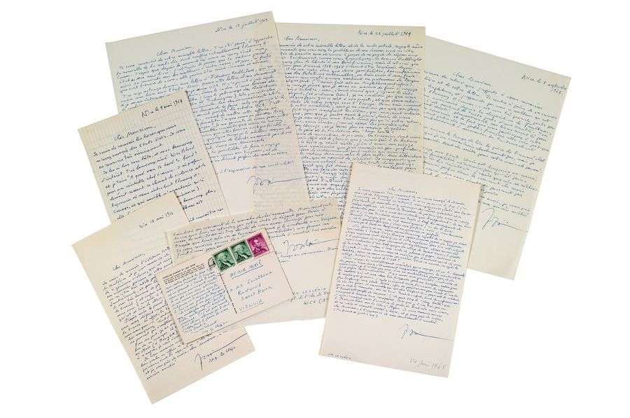 Correspondance littéraire à Maurice COINDREAU 1964-1966, 6 lettres autographes signées de différents formats et une carte postale Intéressante correspondance littéraire de Jean-Marie Le Clézio à Maurice Coindreau, traducteur de Faulkner et professeur de français à l'université de Princeton, qui témoigne de l'attrait de Le Clézio pour les États-Unis et la culture américaine. Le Clézio a déjà reçu le prix Renaudot pour Le Procès-verbal. Il remercie souvent son correspondant pour les auteurs américains qu'il lui fait découvrir: «[...] Vous devez certainement comprendre pourquoi la civilisation américaine je l'ai très peu vue. J'ai vu surtout des paysages et ils sont extraordinaires. Il me semble qu'un des dangers de ce pays est la solitude qu'on doit y ressentir tôt ou tard. Tant de confort, tant de conformisme».
