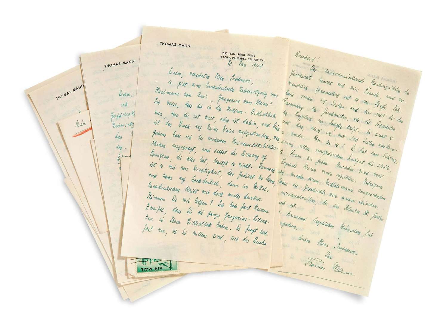6 L.A.S. « Thomas Mann », Pacifi c Palisades (California) 20 janvier-20 mai 1948, au professeur Samuel SINGER à Berne (Suisse) | 12 pages in-8 à l'encre verte sur papier à son en-tête et adresse, 4 enveloppes | en allemand.