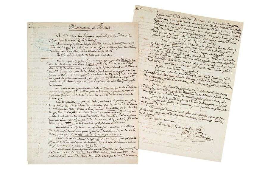 L.A.S. au «Procureur impérial près le Tribunal de police correctionnelle de la Seine». S.l., 10 novembre 1858. 6 pp. in-folio.