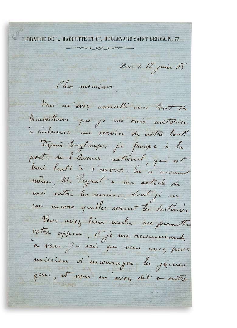 L.A.S. « Emile Zola », Paris 12 juin 1865, à un journaliste de L'Avenir national | 2 pages et demie in-8 à en-tête de la Librairie Hachette et Cie.