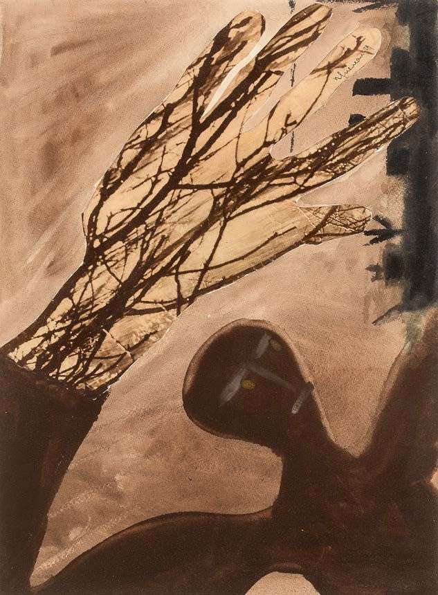 Composition surréaliste. La gouache représente un personnage inquiétant, entièrement noir, dont seul le regard menaçant et la bouche mauvaise sont distincts | placé dans l'angle inférieur gauche de la composition, il lève un bras en pliant le coude. Dépassant de sa manche, un papier collé découpé en forme de grande main parcourue d'artères.