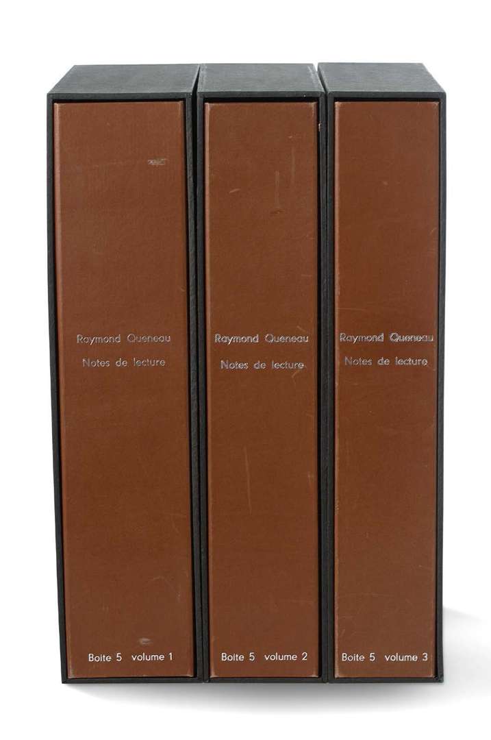 NOTES autographes de lecture et de travail, [vers 1930-1950] | environ 600 pages formats divers, montées sur onglets sur des ff . de papier vélin, le tout relié en 3 forts volumes in-fol., dos en cuir brun gaufré, 3 rubans de couture apparents, plats de médium verni satiné brun, baguettes d'angles et rivets d'ébène, doublures de nubuck gris, chemises et étuis (Jean de Gonet 2002).