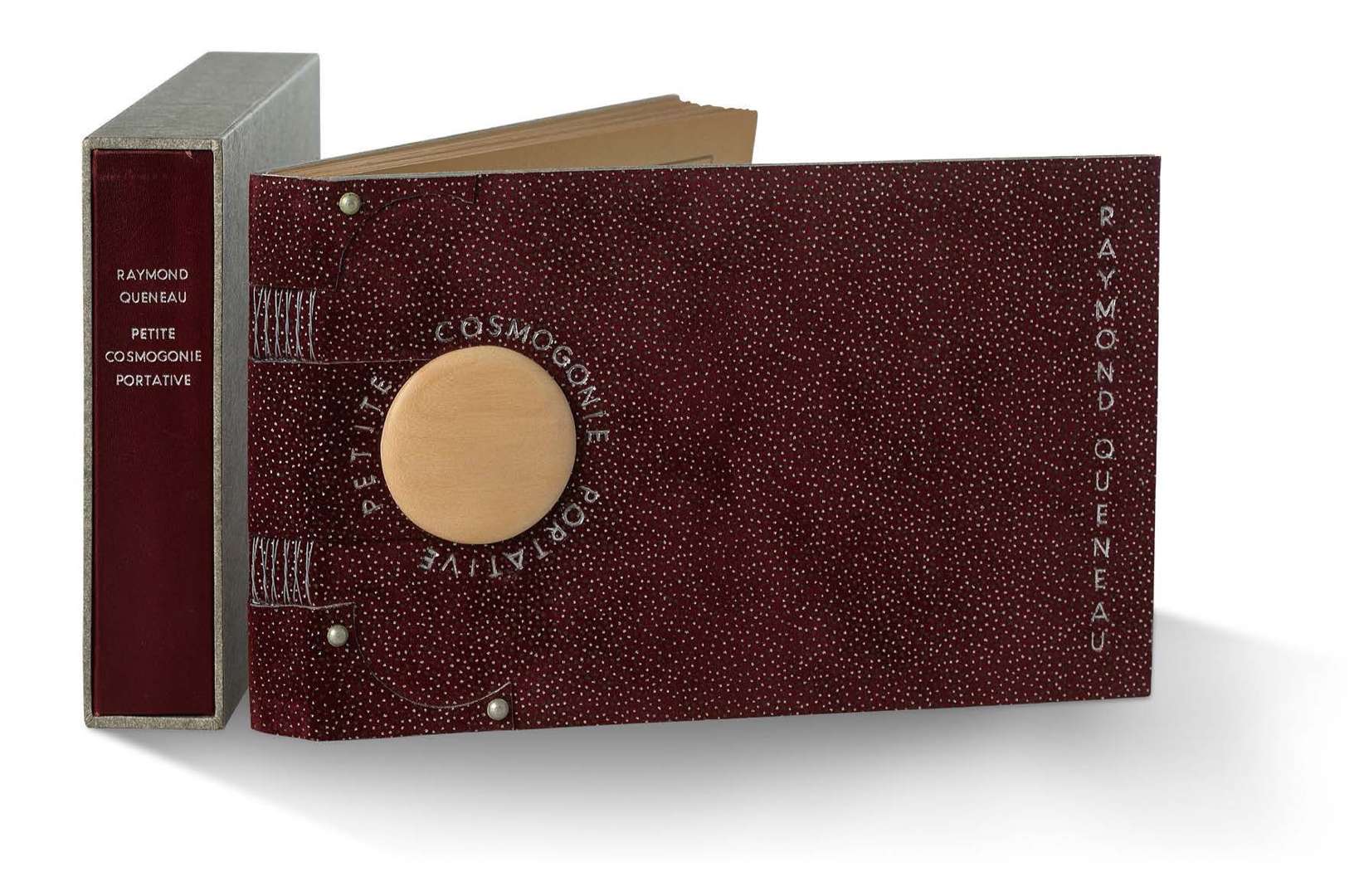 Petite Cosmogonie portative, poème (Paris, Gallimard, 1950) | in-12 oblong, reliure souple daim violet moucheté de points argent et noir, pièce de même peau découpée et rivetée sur le plat sup. avec pièce circulaire de bois clair poli et le titre au palladium, décor mosaïqué (quartier de lune et étoile) en peau blanche vernie sur le 2e plat, coutures apparentes au dos, gardes en nubuck bleu ciel, couverture et dos conservés, chemise titrée au palladium, étui (Antonio P.N.).