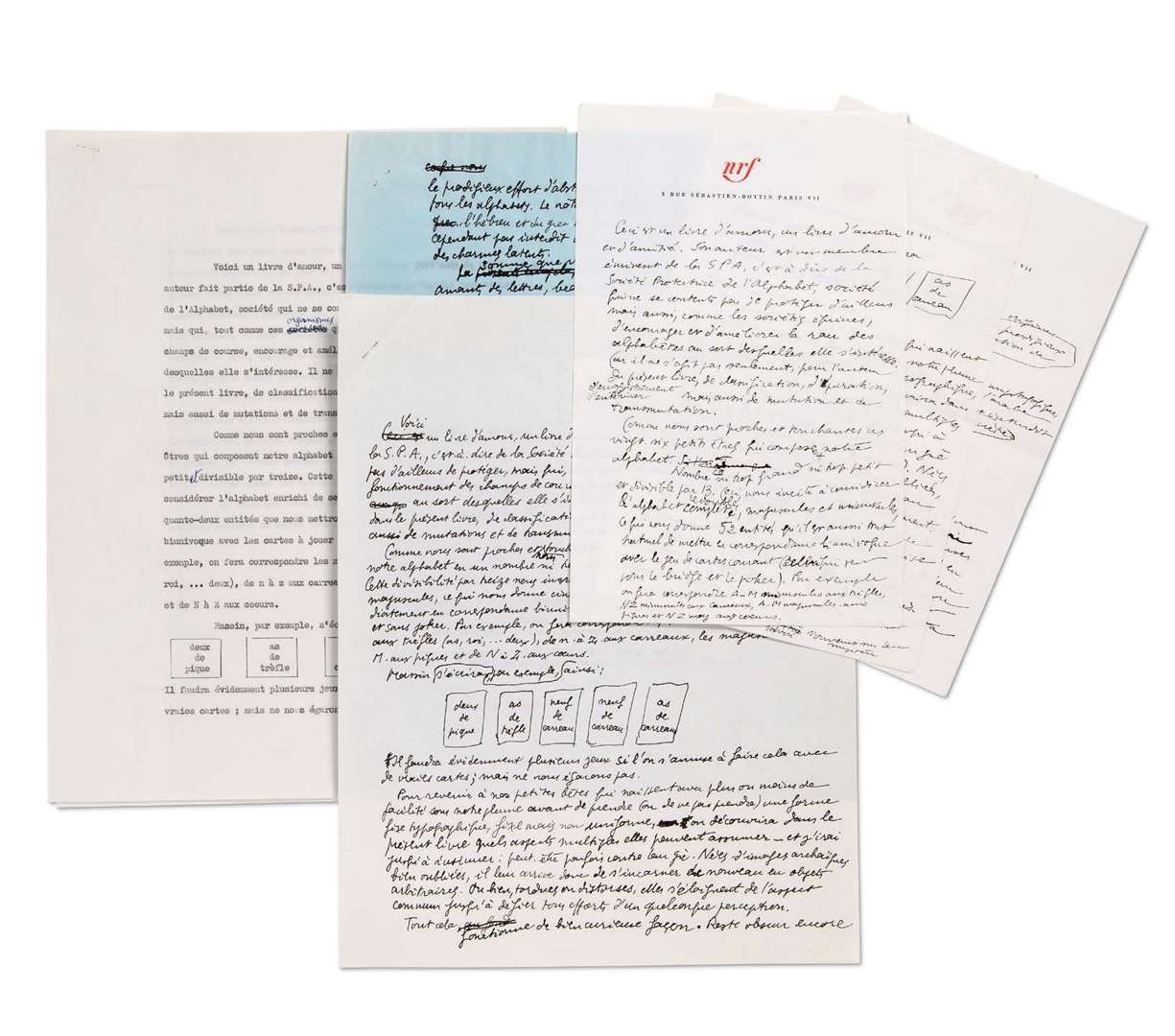 - resse. [...] La somme que voici réserve beaucoup de joie pour les amants des lettres, beaucoup de savoir pour leurs amis ». Queneau cite pour exemple les jeux proposés par Massin et la correspondance entre les lettres de l'alphabet, minuscules et majuscules, et les cartes à jouer, avec cinq croquis de cartes.