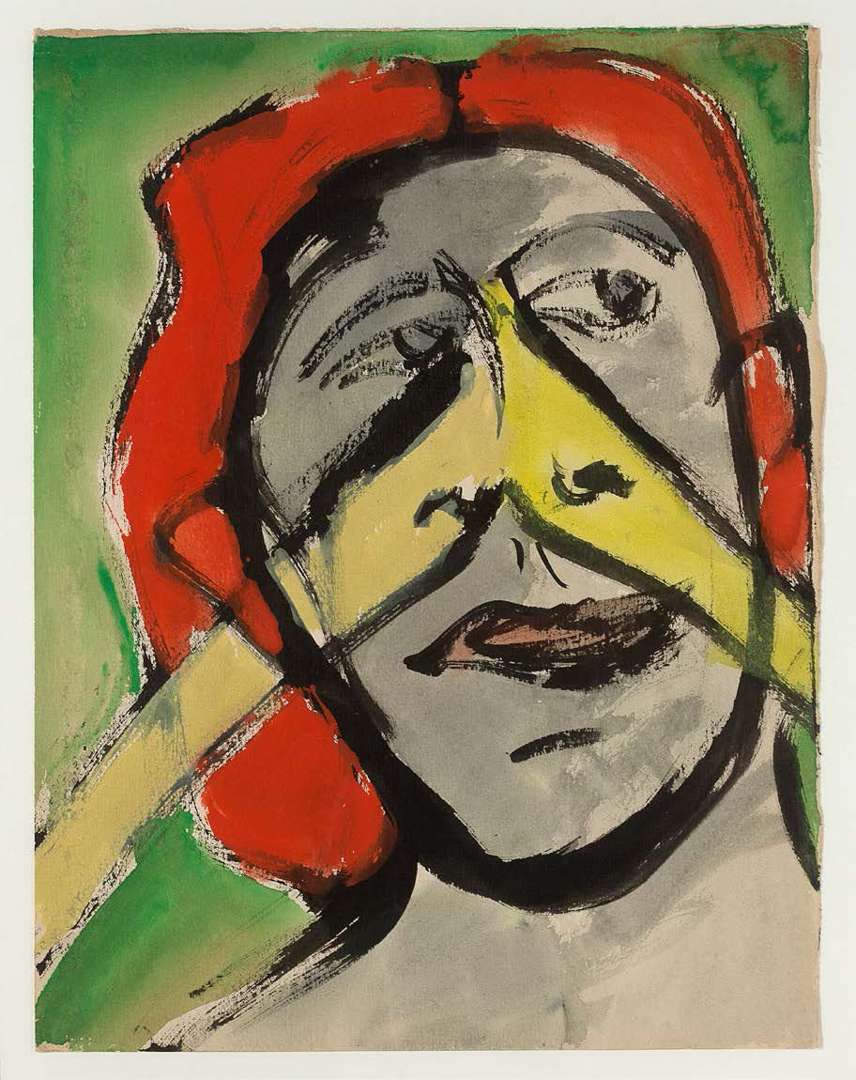 Portrait de femme. Étonnante composition, pleine de mouvement. Le coup de pinceau est rapide. Sur un fond vert se détache la chevelure rouge, tandis qu'un grand chevron jaune dont la pointe est située dans l'axe du nez traverse toute la feuille.
