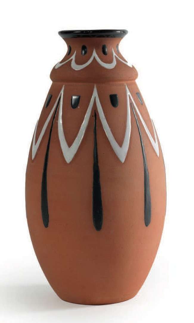 VASE BALUSTRE En terre cuite, décor de motifs géométriques stylisés émaillés noirs et blancs, formant frise en pourtour de la panse et du col.
