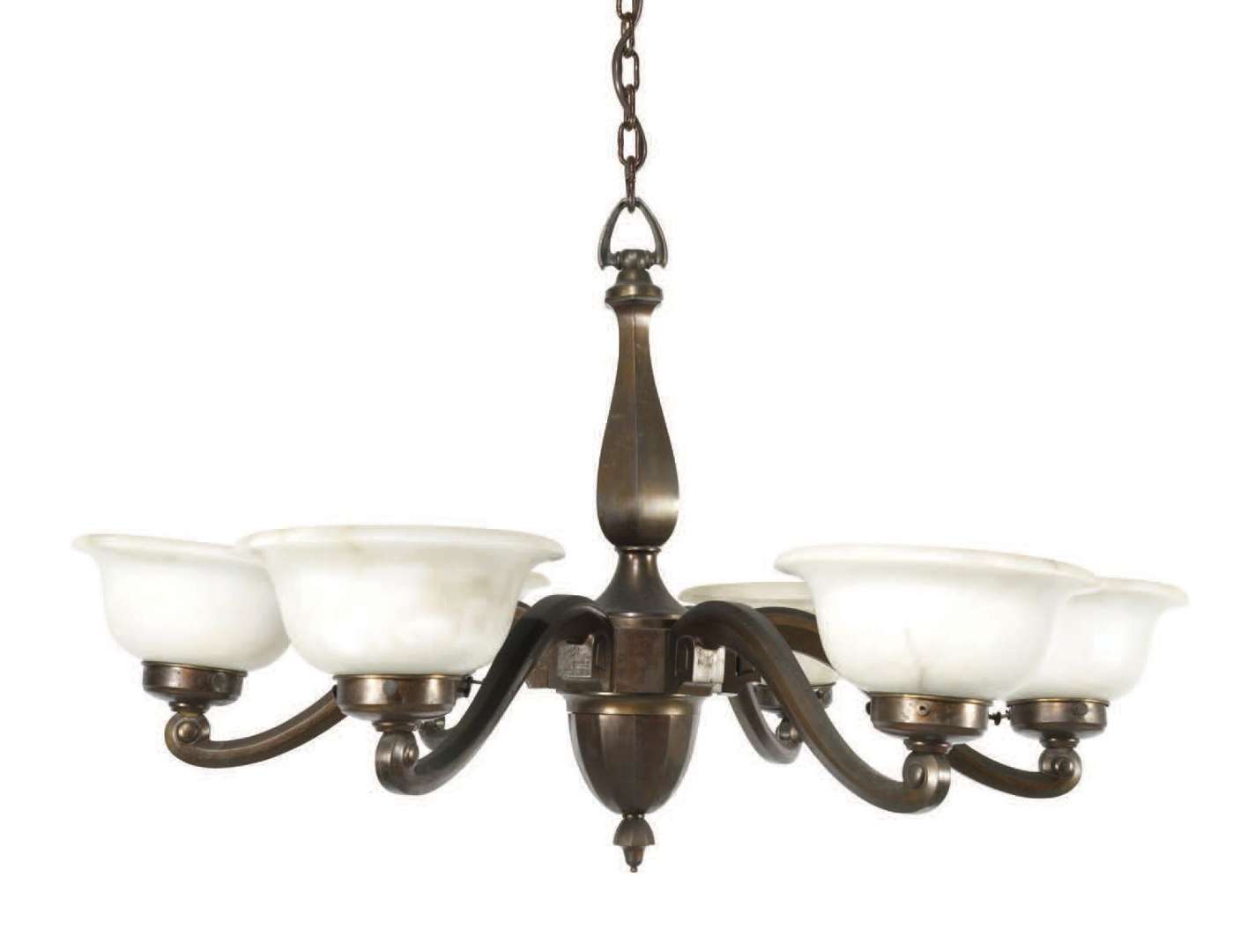 SUSPENSION À SIX BRAS DE LUMIÈRES En métal patiné, coupelles en albâtre.