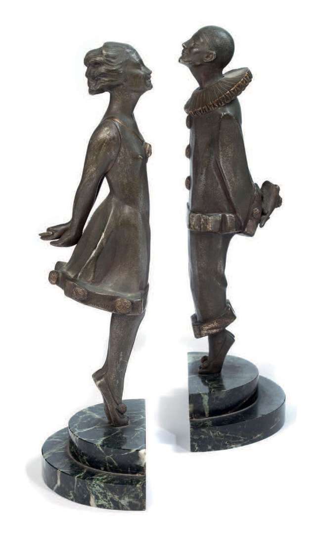 PIERROT ET COLOMBINE Serre-livres en bronze patiné. Épreuves en bronze patiné argent. Base semi-circulaire à gradins en marbre vert écume de mer
