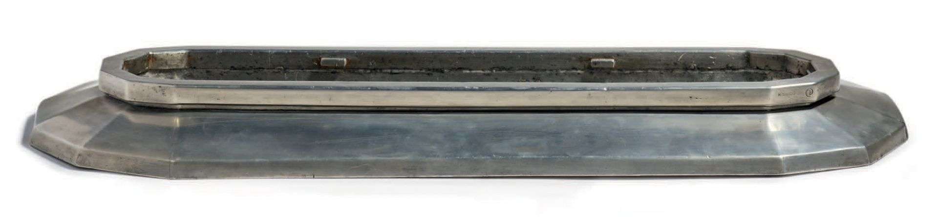 IMPORTANT CENTRE DE TABLE EN ÉTAIN De forme oblongue, reposant sur une base évasée facettée sur les côtés | bassin central en creux accueillant une grille (refaite postérieurement) pour les compositions florales.
