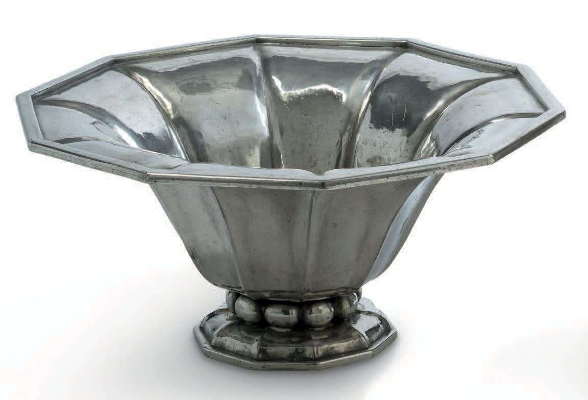 IMPORTANTE COUPE EN ÉTAIN MARTELÉ à 10 pans coupés, à large ouverture évasée, reposant sur une base décagonale surmontée d'un rang de perles ovales.