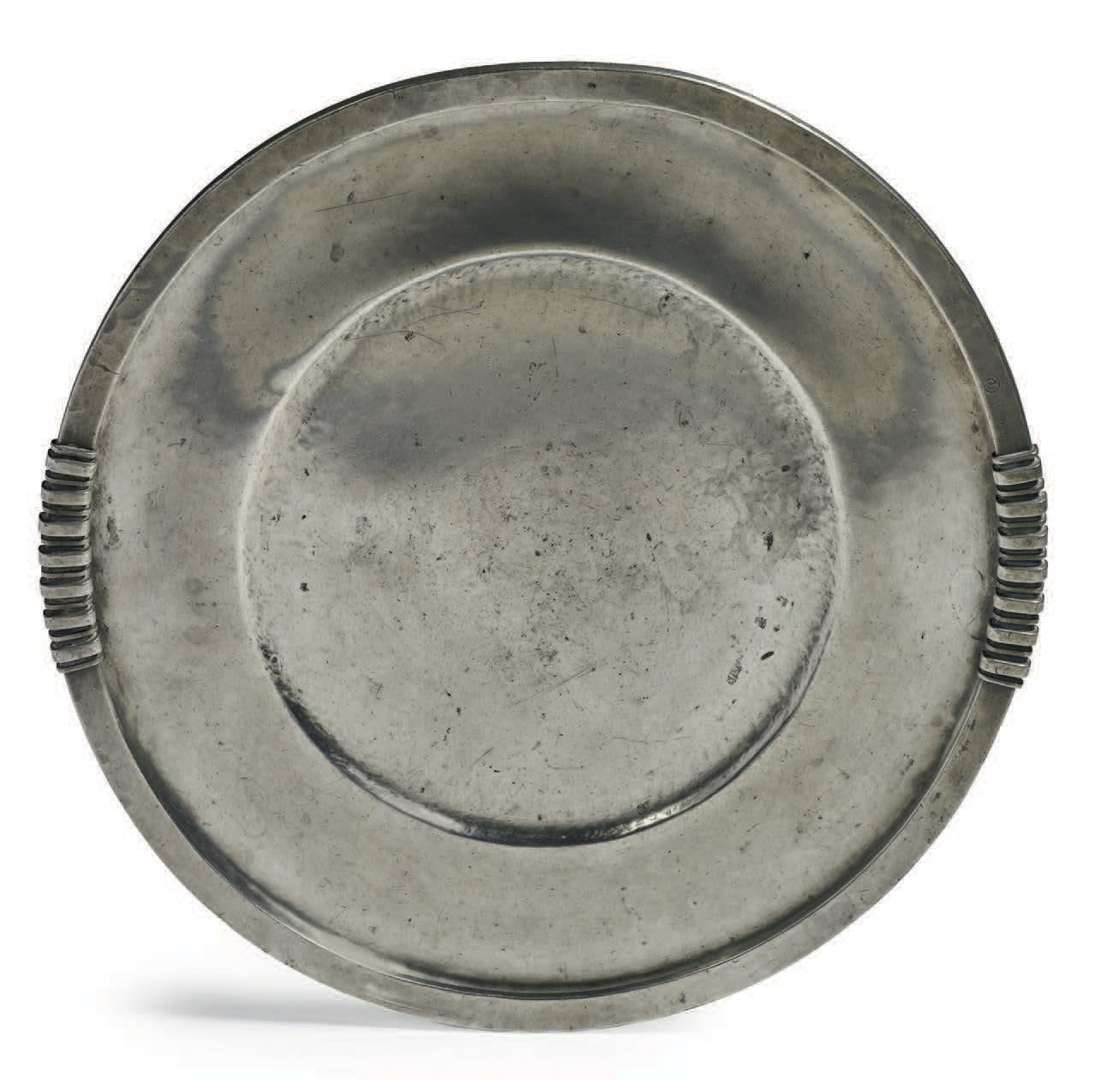 PLATEAU DE FORME CIRCULAIRE En étain martelé à deux prises soulignées en bordure d'éléments annelés.