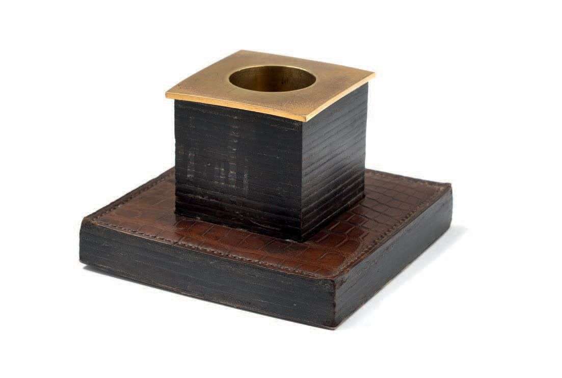 BOUGEOIR Base carrée en cuir brun à l'imitation du crocodile, bobèche en laiton doré.