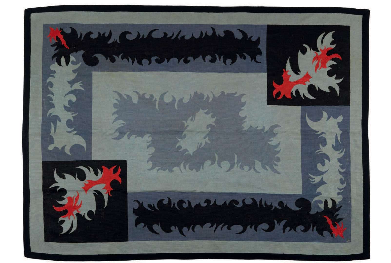 TAPIS RECTANGULAIRE En laine polychrome à fond gris bordé d'un passepoil en coton noir | motif de flammes stylisées noires, rouges et beiges.