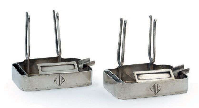 PAIRE DE CENDRIERS PORTATIFS EN ARGENT 925°/°° Réceptacle rectangulaire agrémenté d'un espace de rangement pour les allumettes et d'une fenêtre qui contenait anciennement un grattoir | deux branches en forme de lyre formant support de cigare ou cigarette.
