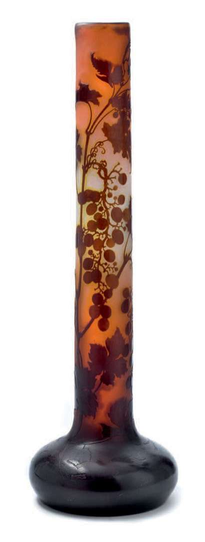 IMPORTANT VASE En verre multicouches à décor de pampres, base circulaire, long col cylindrique. Signé.